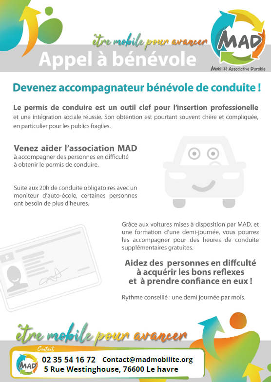 Si vous souhaitez continuer à progresser et prendre de l’expérience en conduite avant de passer votre permis de conduire sans prendre des cours dans une auto-école ou que vous souhaitez reprendre la conduite en toute sécurité, MAD met en place la conduite supervisée. Pour en bénéficier, il faut avoir fait au minimum 20h de conduite en auto-école.